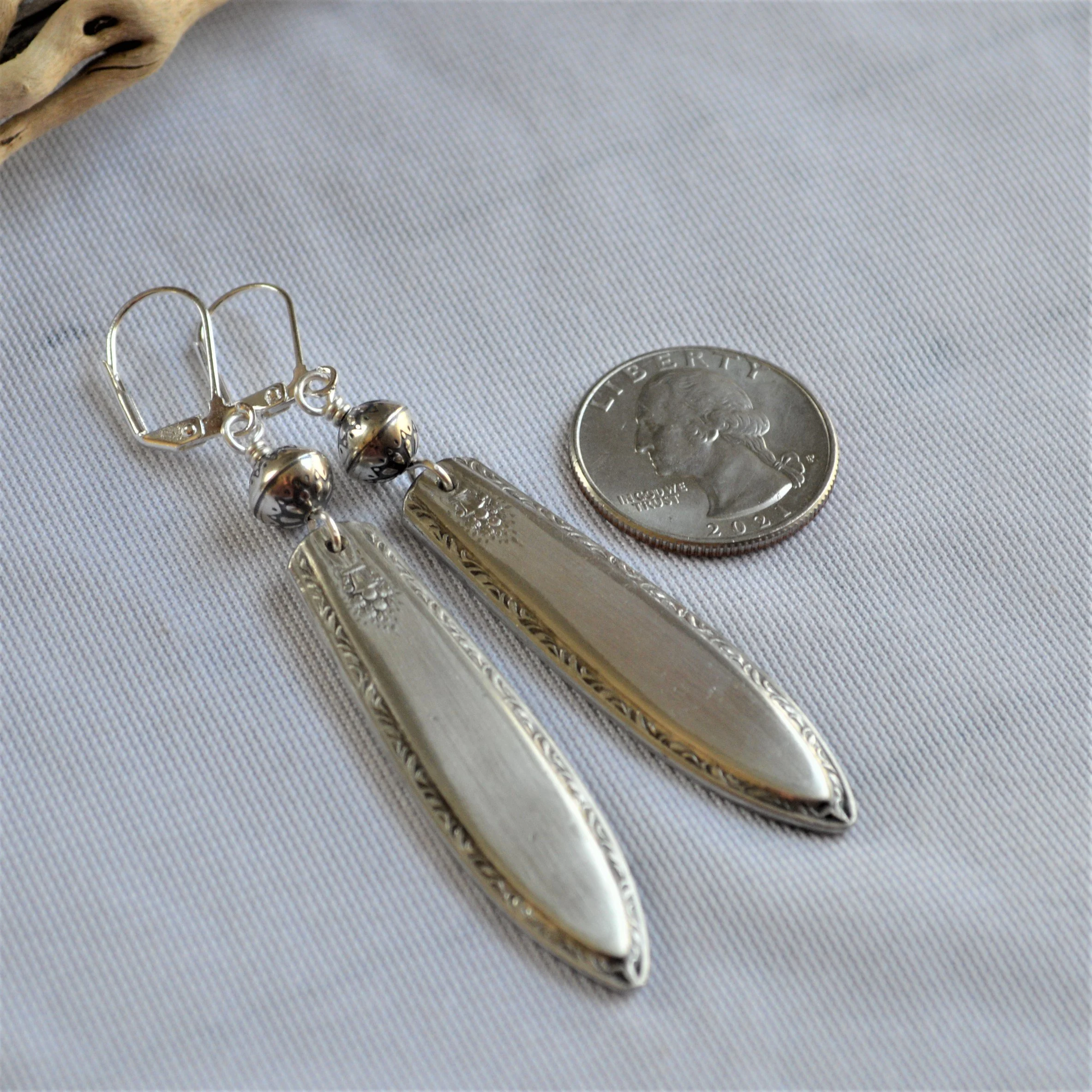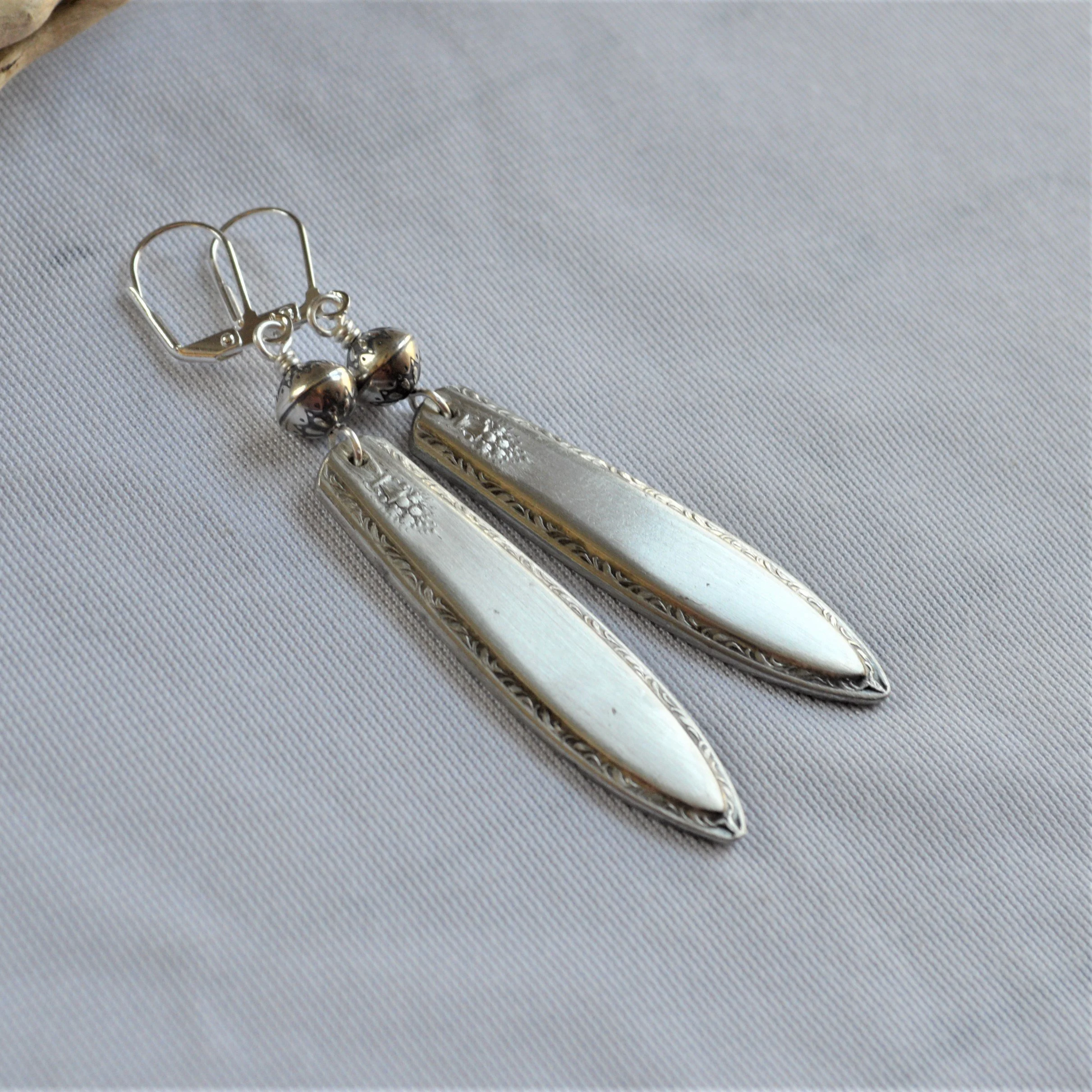 Silver-plated flatware boasts the most stunning patterns, I just couldn’t resist recreating them into something wearable. Each spoon or fork is hand cut, shaped, filed, sanded, hanging holes drilled, cleaned, and sealed to prevent tarnish. It’s a process!